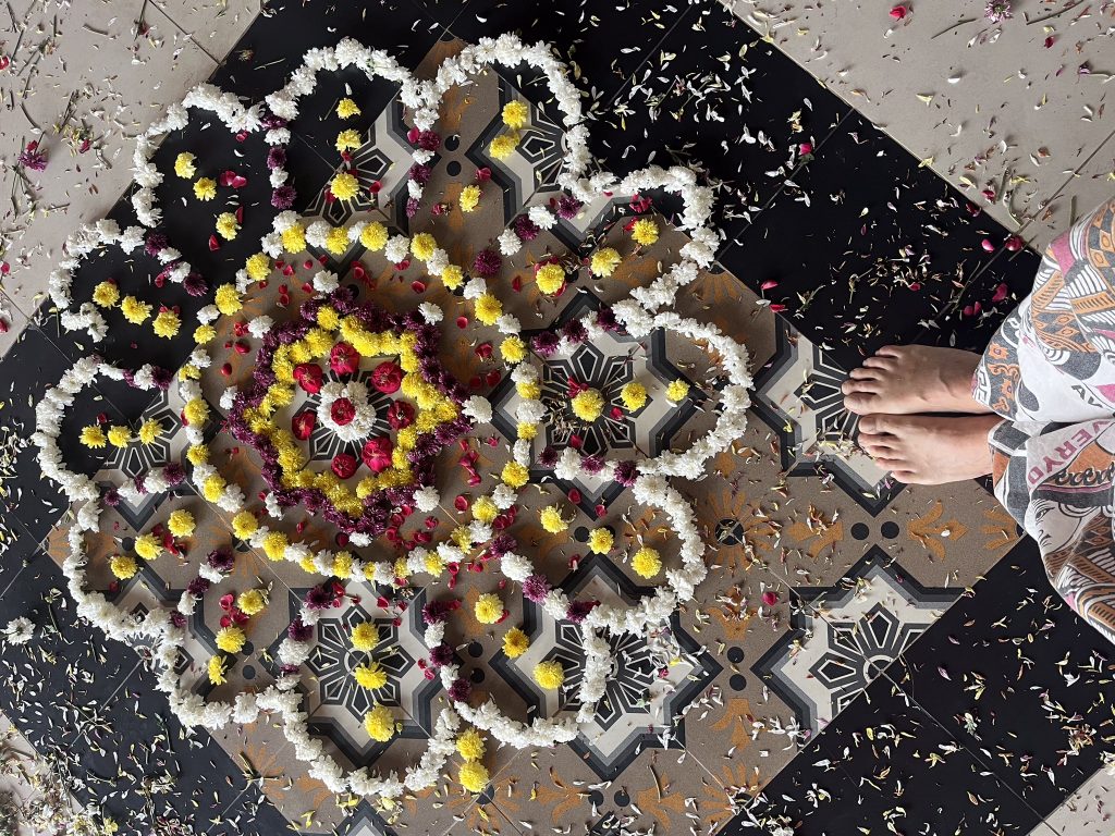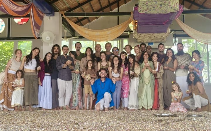 Die Organisatoren hatten säckeweise Blütenblätter organisiert mit denen wir dann eine Blütenschlacht machen konnten, und da mehrere Kinder dabei waren, dauerte es nicht lange, bis sich alle in Kinder verwandelten. Der ganze Raum war bedeckt mit Blütenblättern und Mandalas, die aus Blumen gemacht worden waren, sodass wir danach beim Ecstatic Dance auf Blumen tanzten. Wow.